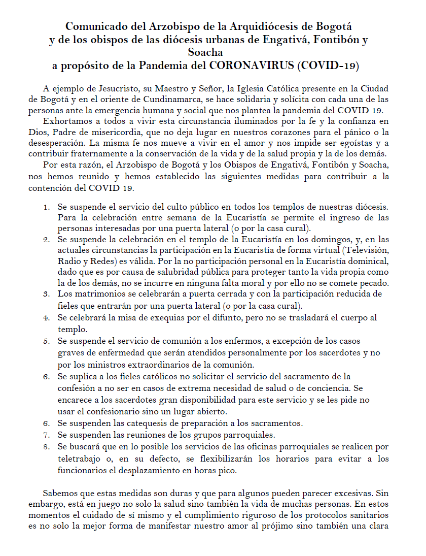 Comunicado del Arzobispo de la Arquidiócesis de Bogotá