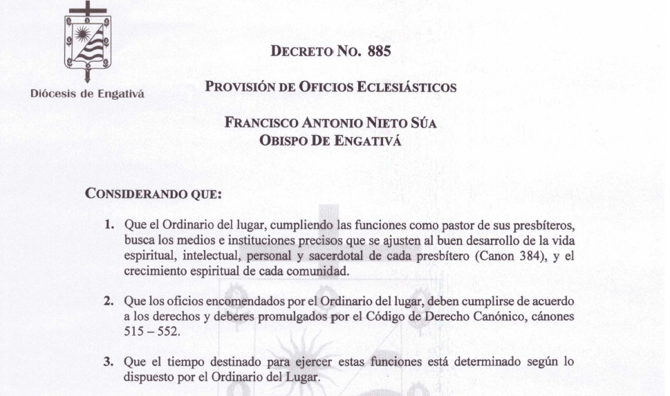 DECRETO No. 885 PARROCOS, ADMON. PARROQUIAL, SERVICIOS ESPECIALES