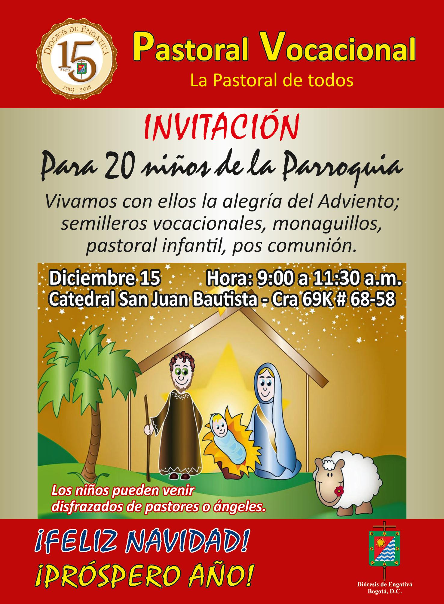 La Pastoral Vocacional invita a los niños de las parroquias a vivir los 15 años de la Diócesis de Engativá, viviendo la alegría del adviento. Por lo tanto los esperamos disfrazados de pastores o ángeles.